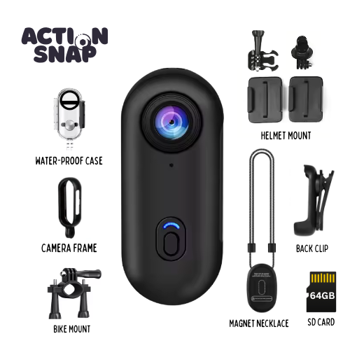 The ActionSnap™ is equipped with an 800mAh rechargeable battery, this camera can record up to 4 hours of 1080P video, or 2 hours of 4K footage.